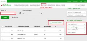 You may choose to use Safaricom Self-care to download your Mpesa statement online.  Safaricom’s self-care service enables customers to easily manage their Safaricom account online through the Self-care portal.