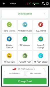 Below these two buttons is an option for changing the email address to which the M-Pesa statement will be sent.